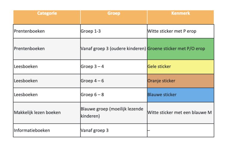 Met een indeling per kleur kan een leerling een boek van zijn of haar niveau vinden. Leden van het team helpen bij het uitlenen van de boeken, zorgen ervoor dat de bibliotheek netjes en overzichtelijk is, de boeken er verzorgd uitzien én de boeken weer (op tijd) ingeleverd worden. Leerlingen kunnen op dinsdag* terecht in de bibliotheek om boeken te ruilen.